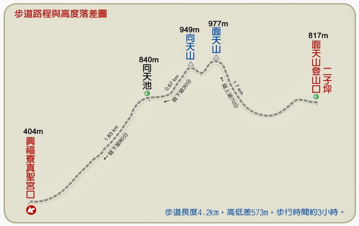 面天山登山口→面天山頂→向天山→向天池→清天宮登山口。