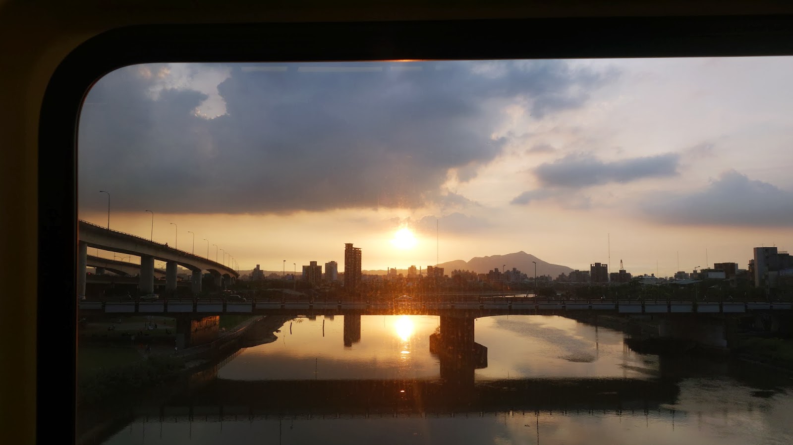 過了民權西路站,列車探出頭來,迎接難得的落日夕照。