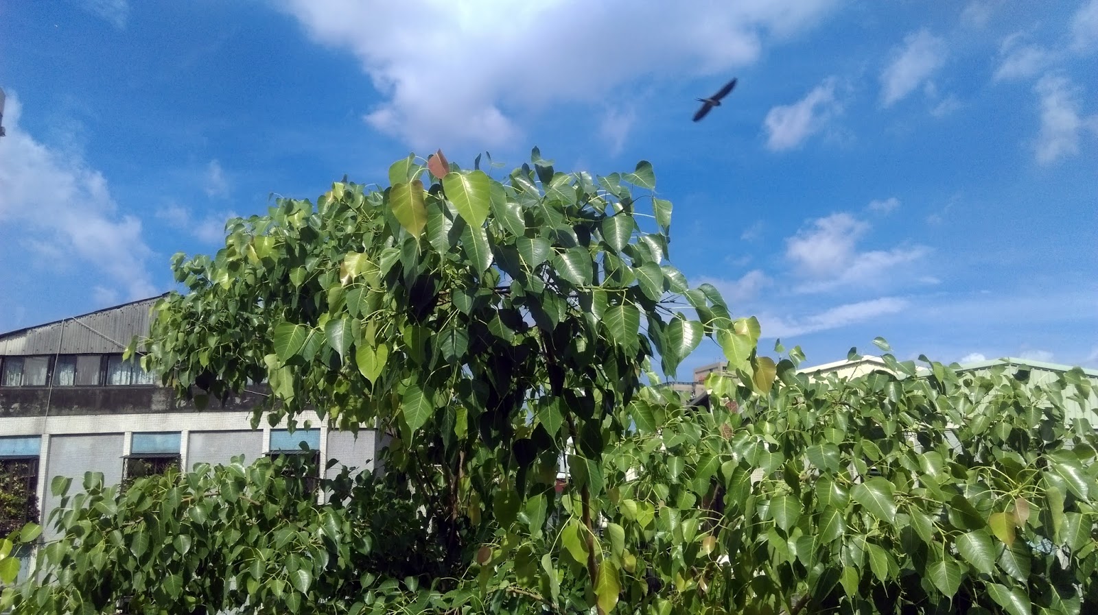 今晨進城的列車上,按下快門時,只想記錄六月菩提的鮮綠。沒料到竟也將附近的飛鳥身影,留了下來。